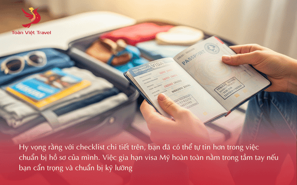 Hy vọng rằng với checklist chi tiết trên, bạn đã có thể tự tin hơn trong việc chuẩn bị hồ sơ của mình. Việc gia hạn visa Mỹ hoàn toàn nằm trong tầm tay nếu bạn cẩn trọng và chuẩn bị kỹ lưỡng.