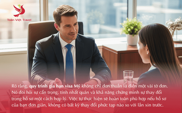 Về bản chất, "gia hạn" là một quy trình xét duyệt lại hồ sơ của bạn dựa trên những thông tin cập nhật. Viên chức Lãnh sự sẽ không tự động cấp visa mới. Lịch sử bạn đã tuân thủ đúng luật di trú trong chuyến đi Mỹ trước đó là một lợi thế cực kỳ lớn, nhưng không phải là tất cả.